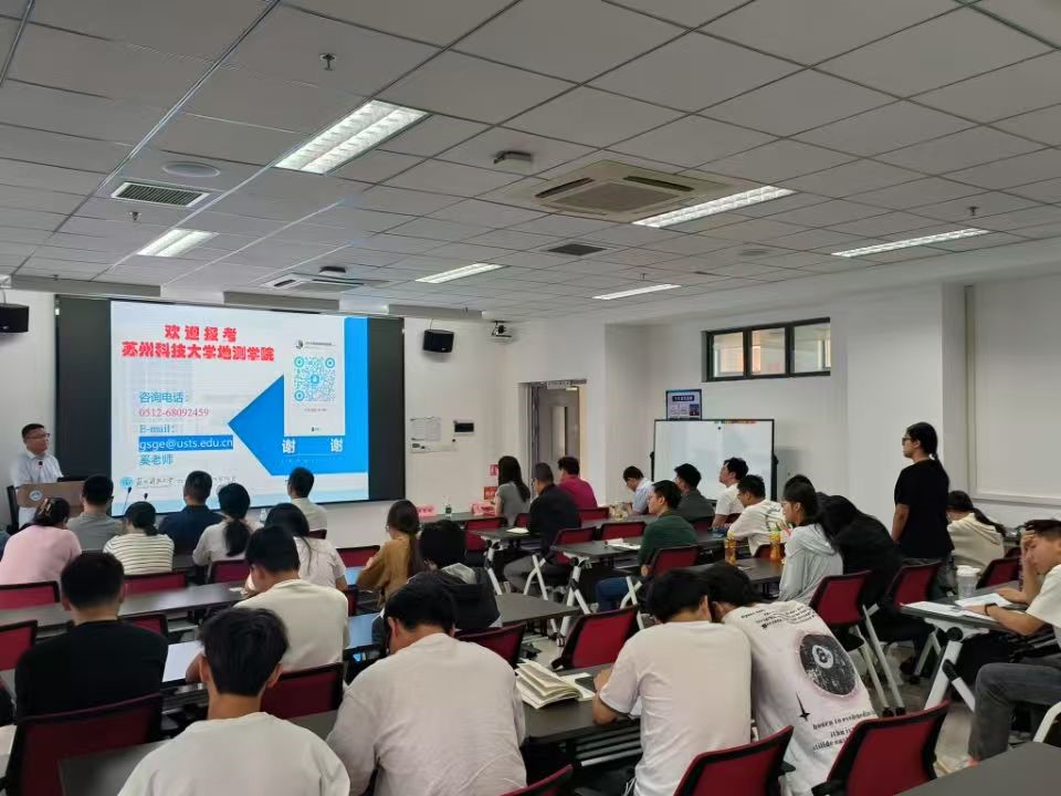 大气与遥感学院党委副书记范雪、副院长郭秀峰等师生40余人亲临现场,对我院到访表示热烈欢迎。陈德超首先播放了苏州科技大学的宣传片,随后对地测学院以及测绘工程专业硕士进行了介绍,主要围绕专业发展历程,研究方向、导师队伍以及研究成果等进行了系统讲解。学生们积极提问,现场气氛热烈。本次宣讲活动,加强了我院与兄弟院校的交流,为测绘工程领域扩大优秀生源规模,提高人才培养质量奠定基础。